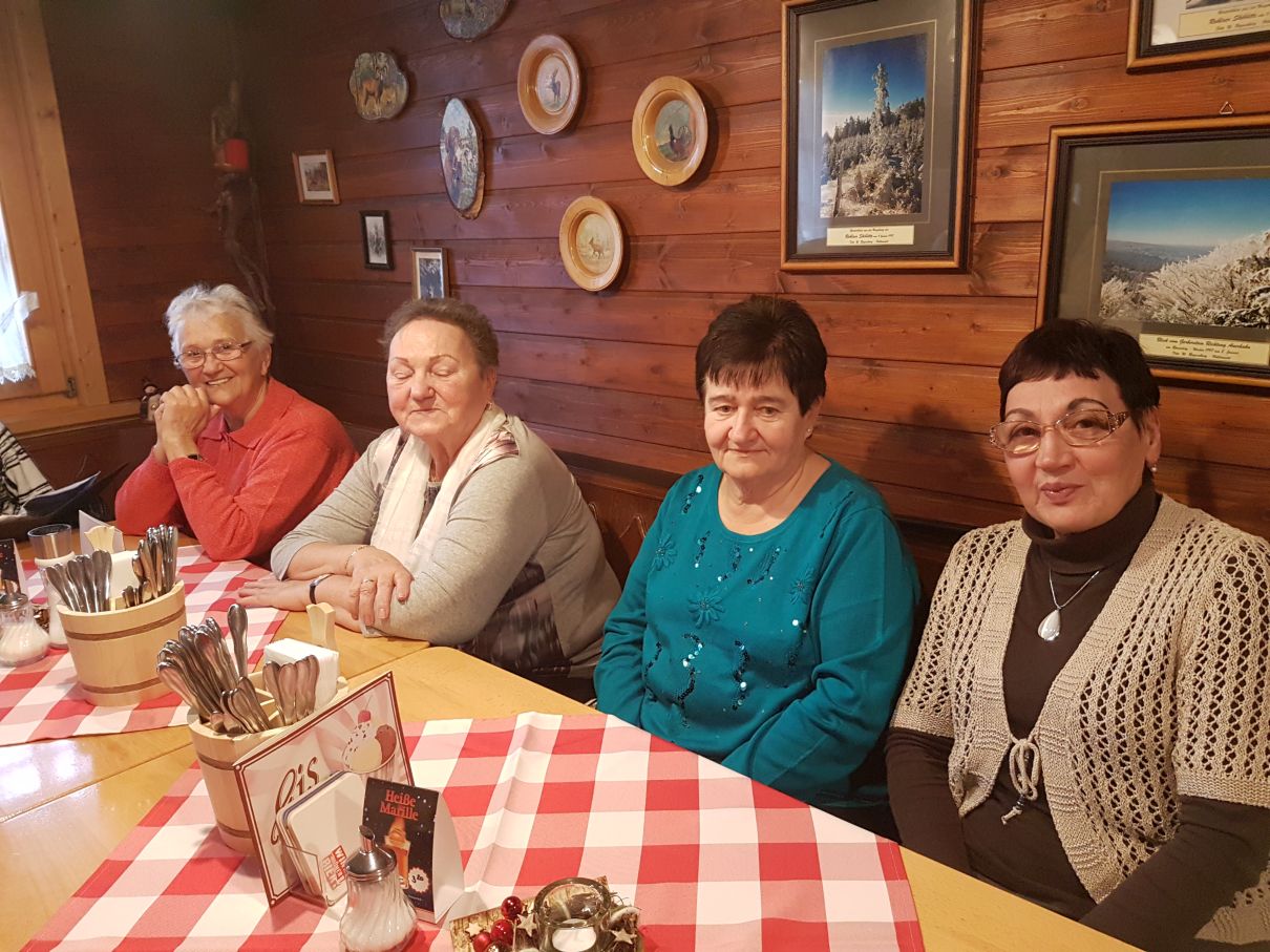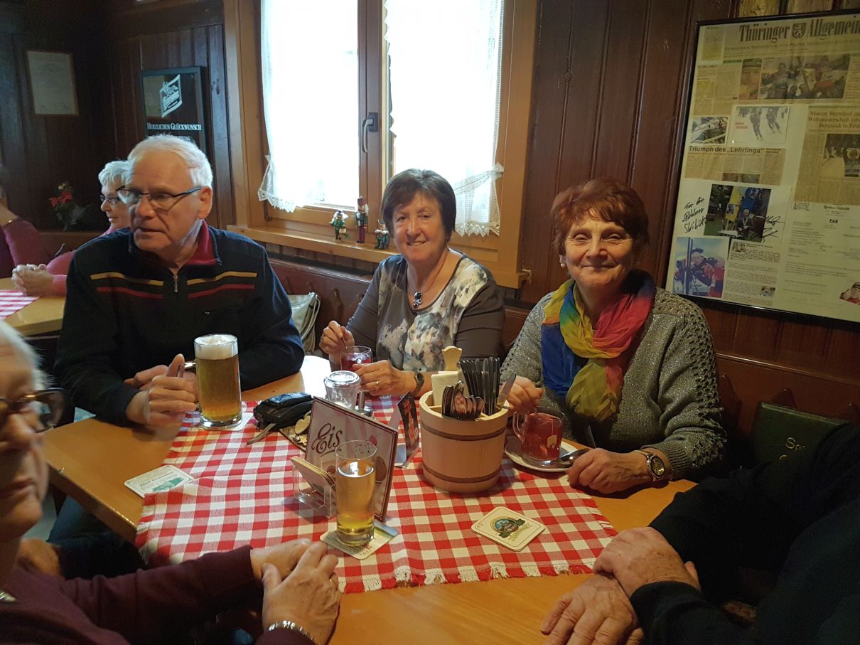 Für viele Mitglieder der wbg ist sie mittlerweile Tradition: Die jährliche Adventsfahrt. Dieses Jahr fuhren 64 Reisende am 24. November gut gelaunt nach Ruhla. Pünktlich um zwölf startete die Gruppe und konnte bereits unterwegs die herrliche Landschaft bewundern. Das Reiseziel, das Waldgasthaus Ruhlaer Skihütte, begrüßte die Gäste mit gemütlicher, rustikaler Hüttenatmosphäre und einem deftigen, weihnachtlichen Mittagessen. Es gab eine Ruhlaer Spezialität: Herzhaft dicke Rippen und Hüt´s, dicke Schweinerippen mit kräftiger Soße und original Thüringer Klößen mit Mischgemüse.