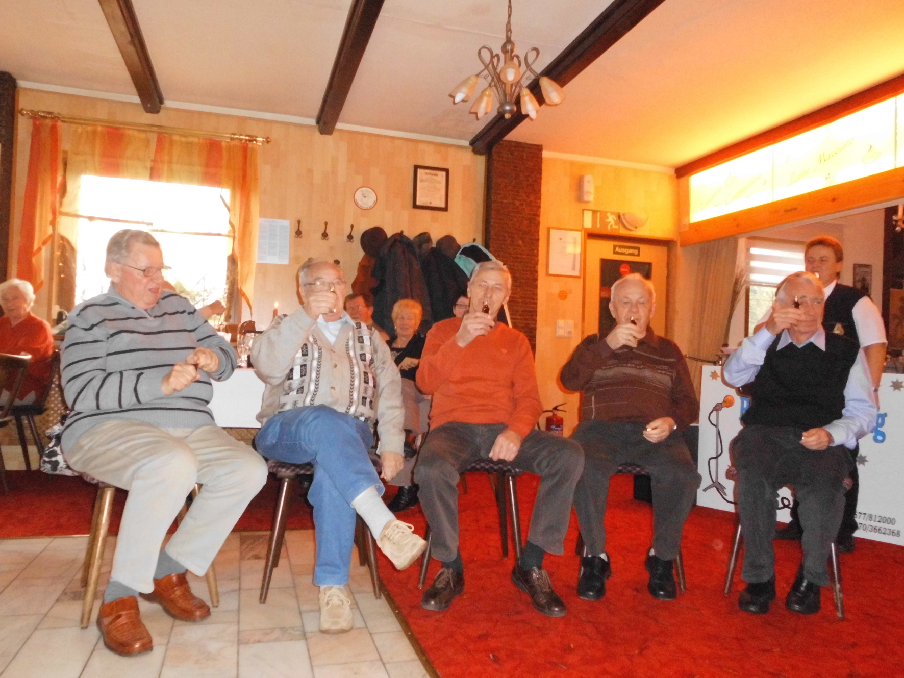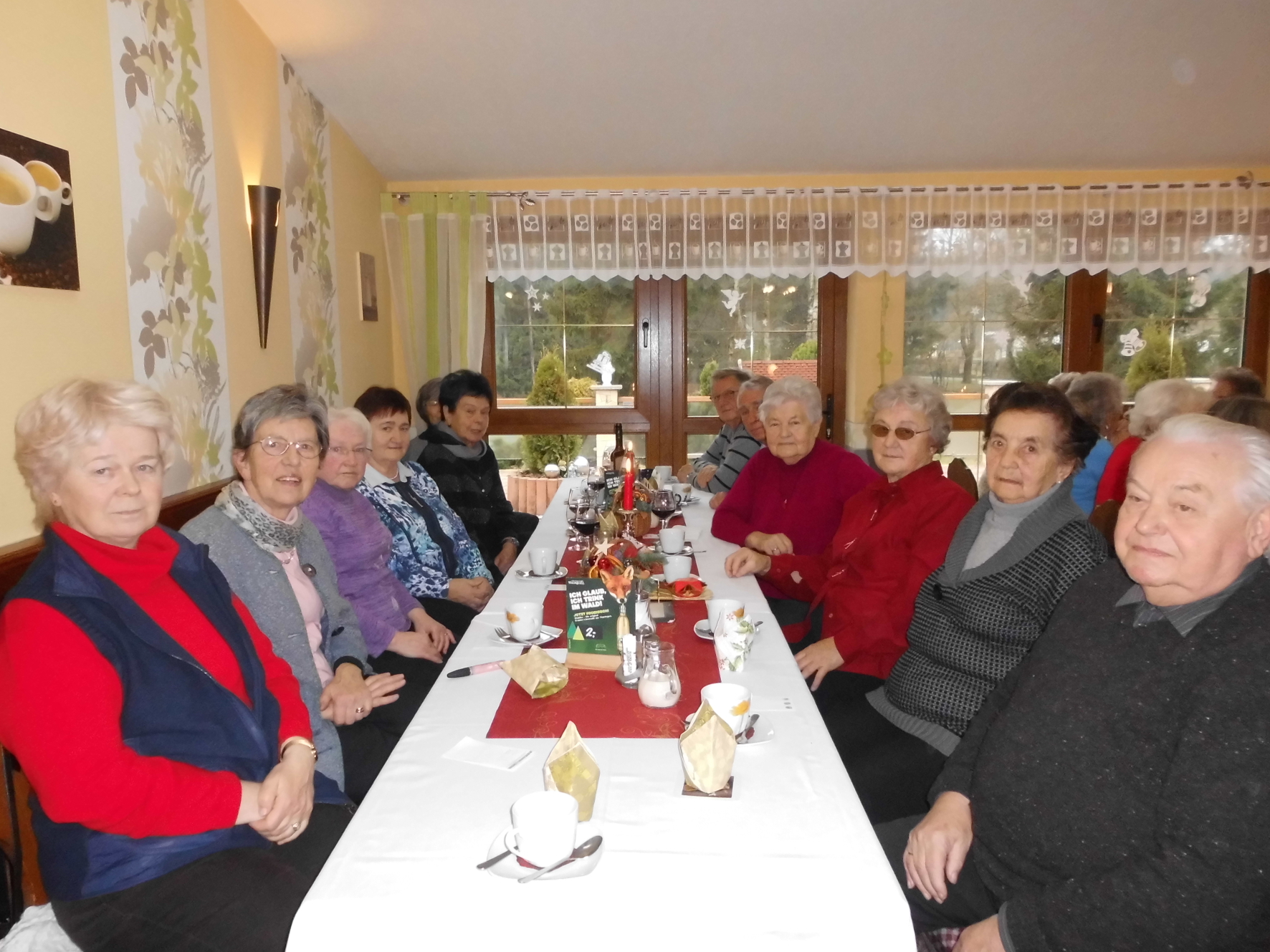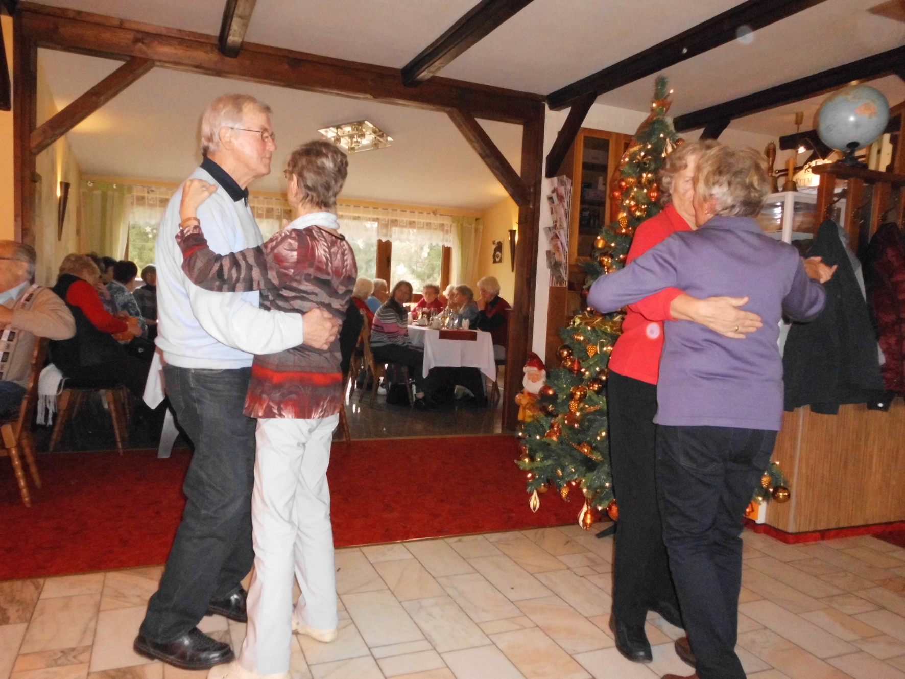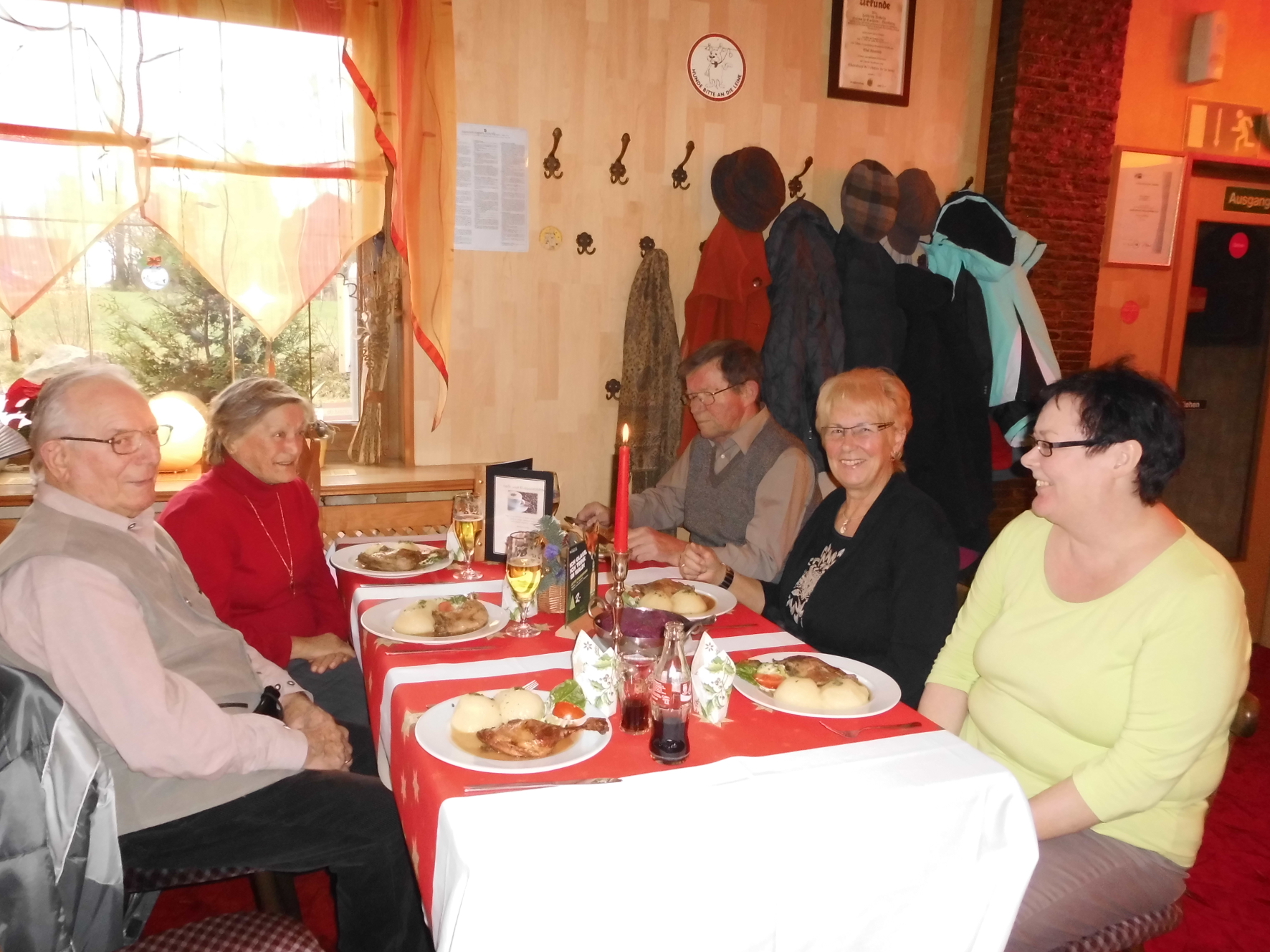 Nach ca. 90 Minuten erreichten wir bereits Großbreitenbach. Die Stadt ist vor allem durch die Biathlon-Schwestern Andrea und Manuela Henkel bekannt. In der gemütlichen Waldbaude wurden wir bereits zum Mittagessen erwartet und mit einer köstlichen Entenkeule mit Klößen und Rotkohl verwöhnt. Anschließend sorgte „Sabine“ mit einem bunten Programm aus Spielen und musikalischer Unterhaltung für ausgelassene Stimmung. Mit weihnachtlichen Liedern wurden wir auf die anstehende Weihnachtszeit eingestimmt und verbrachten gesellige Stunden. Nach leckerem Kaffee und Kuchen konnte noch einmal das Tanzbein geschwungen werden, bevor wir wieder Abschied nehmen mussten. Entlang von weihnachtlich geschmückten Häusern und Straßen traten wir am frühen Abend die Heimreise nach Gotha an.