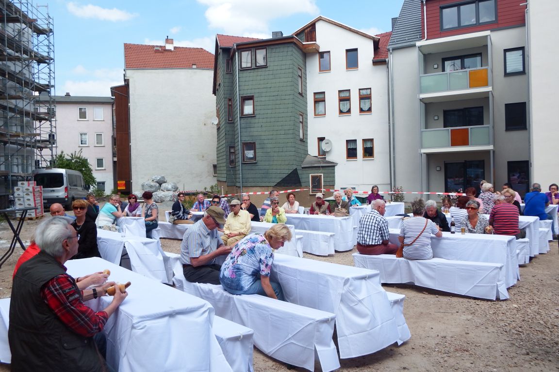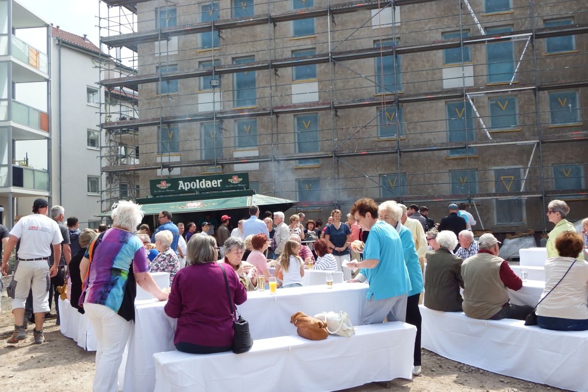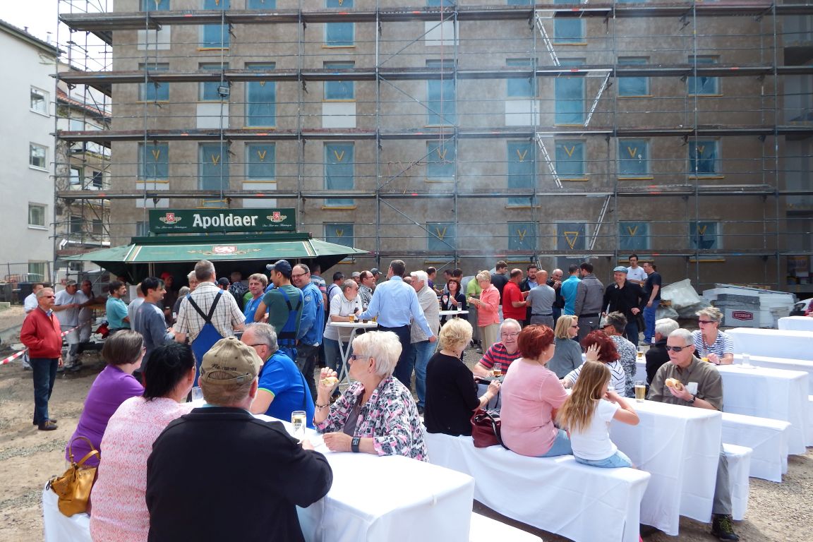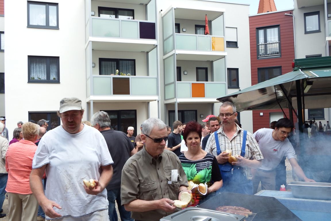 Bei bester Stimmung trafen sich am Donnerstag die Mitglieder und zukünftigen Mieter der wbg sowie die beteiligten Bauarbeiter, um bei einem zünftigen Bratwurstfest im Innenhof des Brühlkarrees auf den Baufortschritt anzustoßen. Heike Backhaus nutze die Gelegenheit, um sich bei allen Beteiligten für ihre tatkräftige Unterstützung zu bedanken. Zwischen den neugebauten Häusern im Brühl und der Baustelle Fritzelsgasse/Blumenbachstraße ließen sich die Gäste die frisch gegrillten Würste bei kühlen Getränken schmecken.