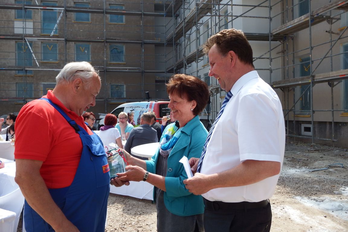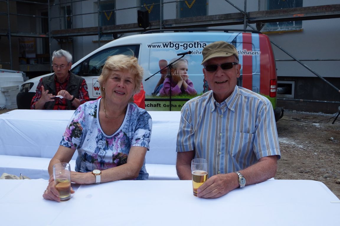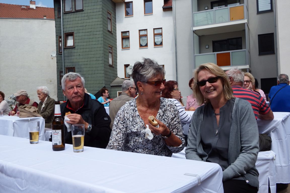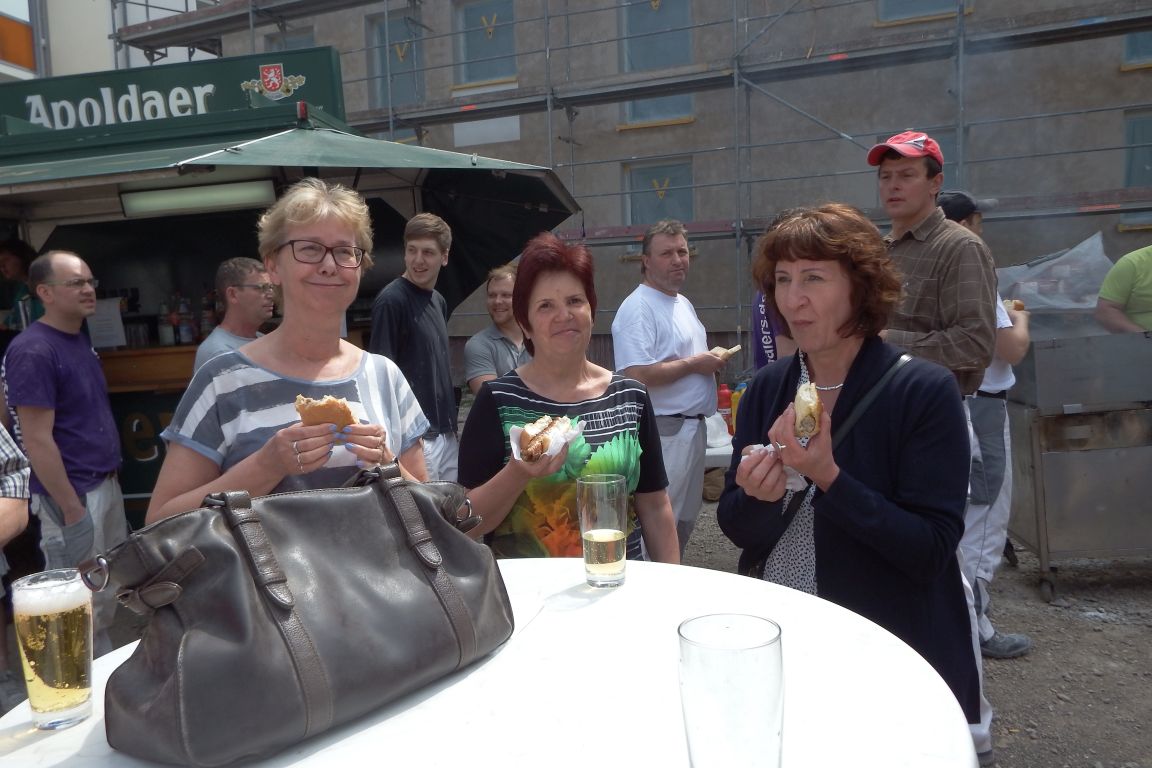 Bei bester Stimmung trafen sich am Donnerstag die Mitglieder und zukünftigen Mieter der wbg sowie die beteiligten Bauarbeiter, um bei einem zünftigen Bratwurstfest im Innenhof des Brühlkarrees auf den Baufortschritt anzustoßen. Heike Backhaus nutze die Gelegenheit, um sich bei allen Beteiligten für ihre tatkräftige Unterstützung zu bedanken. Zwischen den neugebauten Häusern im Brühl und der Baustelle Fritzelsgasse/Blumenbachstraße ließen sich die Gäste die frisch gegrillten Würste bei kühlen Getränken schmecken.
