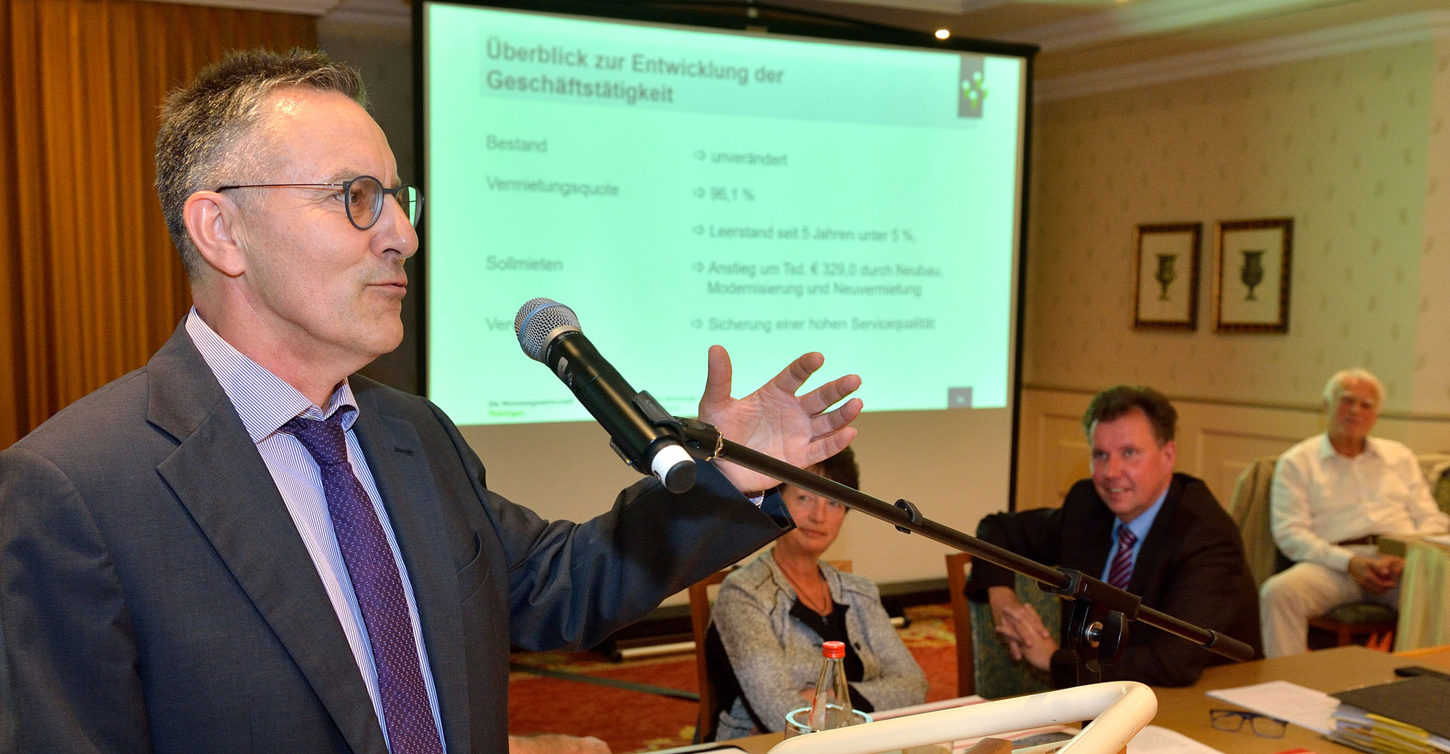 Der kaufmännische Vorstand Steffen Priebe stellte dagegen die Zahlen vor, die das Geschäftsjahr bestimmten. Eine besonders erfreuliche Entwicklung seien die Umsatzerlöse aus der Hausbewirtschaftung, welche deutlich angestiegen sind. Dabei betonte er: „Das passierte nicht etwa nur durch eine Mieterhöhung, sondern durch die Schaffung neuer Wohnungen, die sehr gut angenommen wurden.“ Hervorstechend ist auch die Unterschreitung der „magischen Grenze“ von 30 Millionen in Verbindlichkeiten.