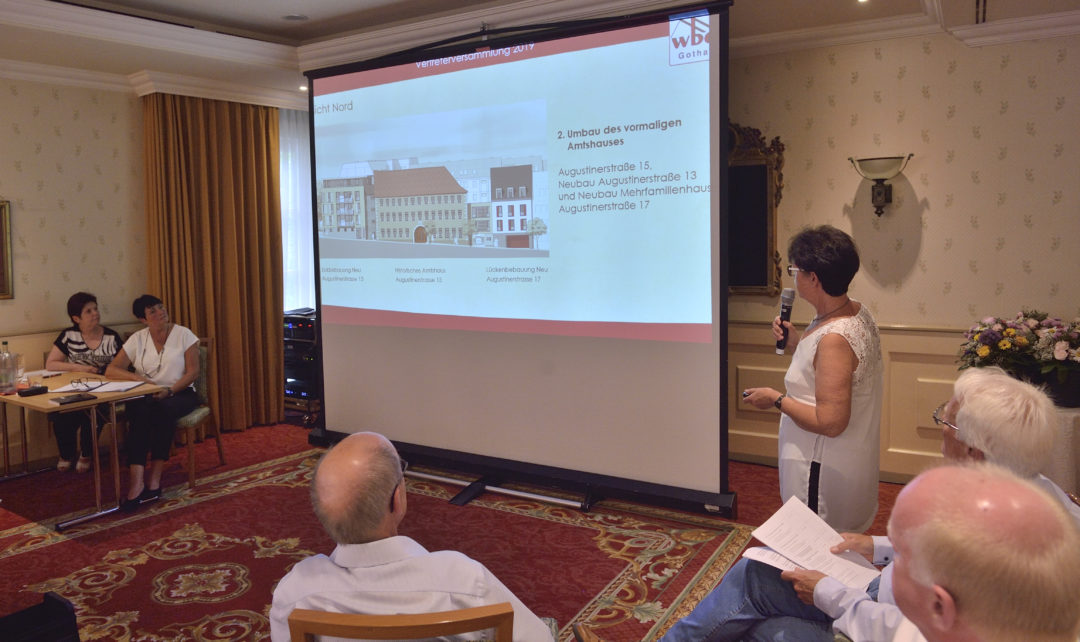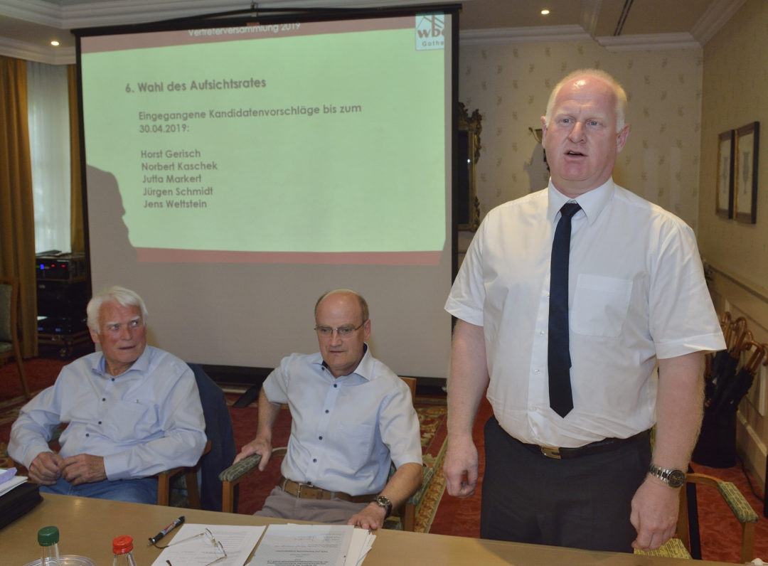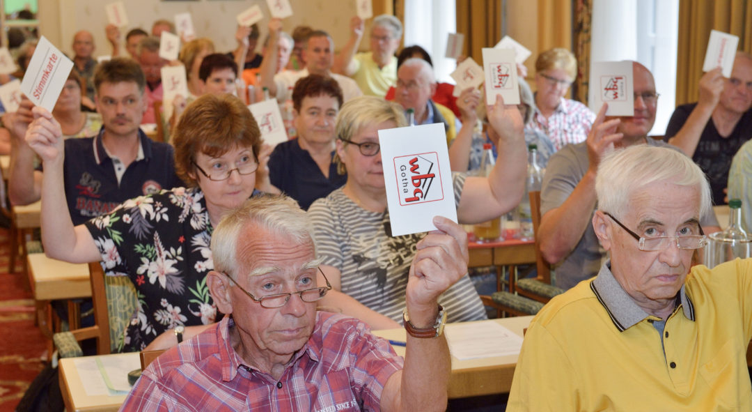 Zur Vertreterversammlung der wbg beraten jedes Jahr Ende Juni der Aufsichtsrat und Vorstand der wbg mit den Vertreterinnen und Vertretern der rund 2.700 Genossenschaftsmitglieder die Ergebnisse des vergangenen Wirtschaftsjahres. Der Vorstand und Aufsichtsrat stellte den Jahresbericht 2018 vor, bevor das Gremium im Anschluss gemeinsam strategische Beschlüsse für die weitere Entwicklung der ältesten Gothaer Genossenschaft fasste.
