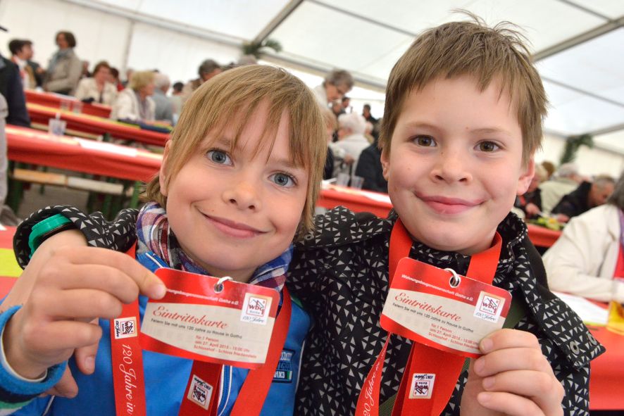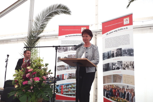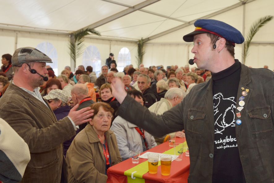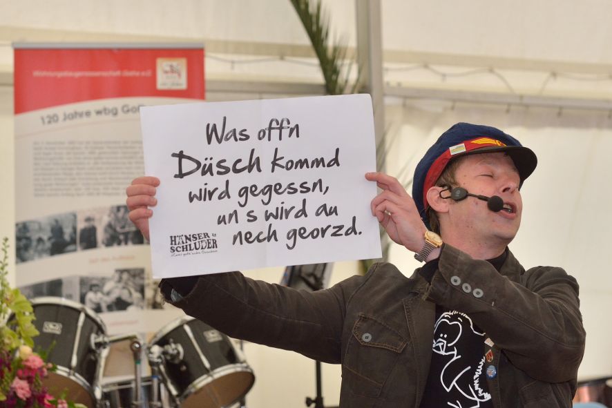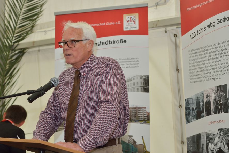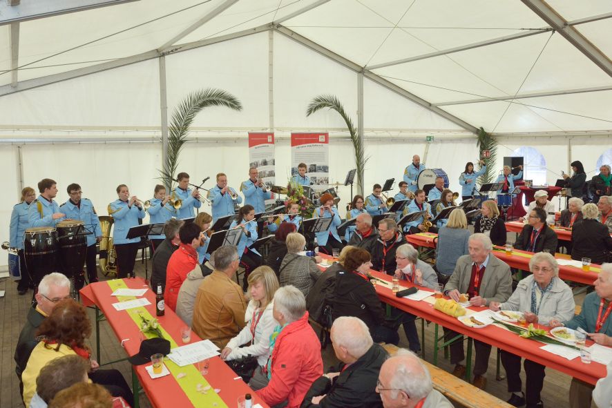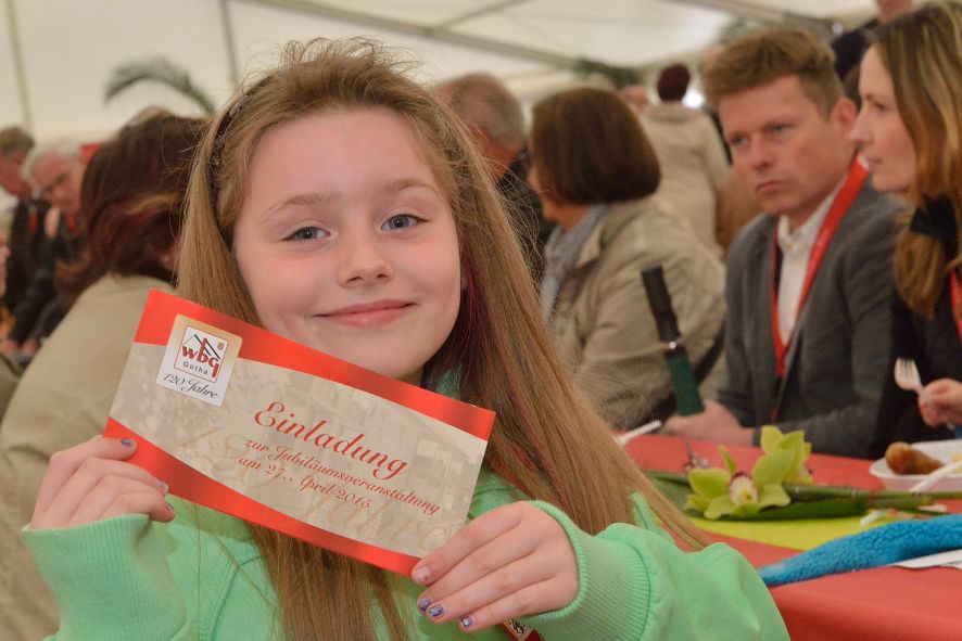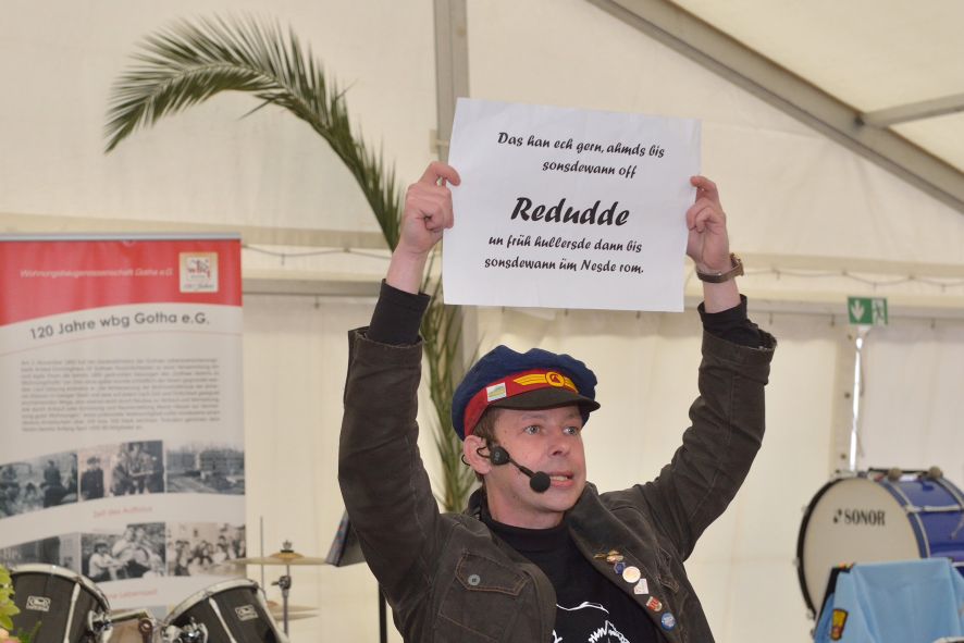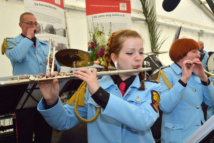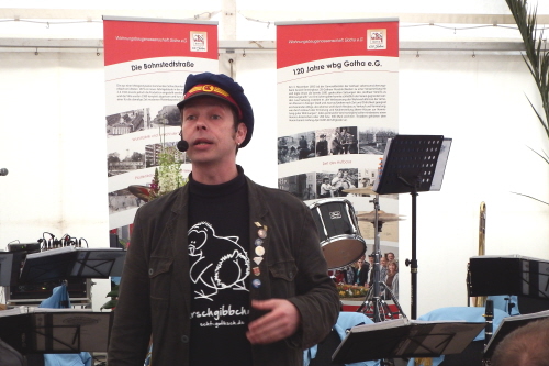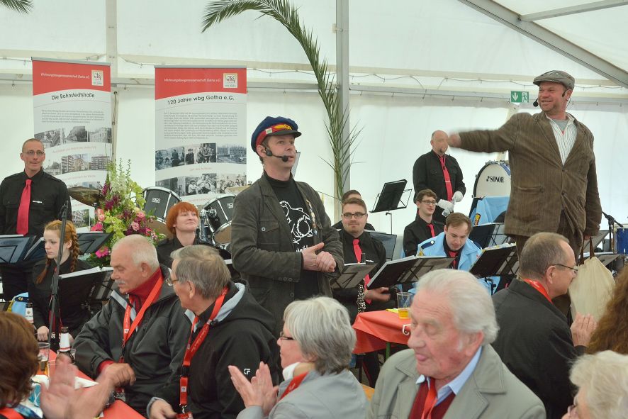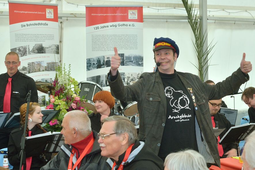 Viele Mitglieder nutzten den Nachmittag für intensive Gespräche und Erinnerungen – auf zehn Fahnen hatte die wbg ihre Geschichte in Bildern zusammengetragen. Die beiden Gothschen Originale Hänser und Schluder sorgten für einige Lacher im Festzelt – bei Atemlos, gespielt vom Fanfaren-und Showorchester Gotha, riss es schließlich die Mitglieder von den Plätzen und ließ viele lautstark mitsingen.