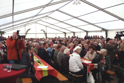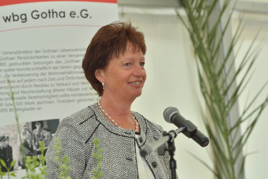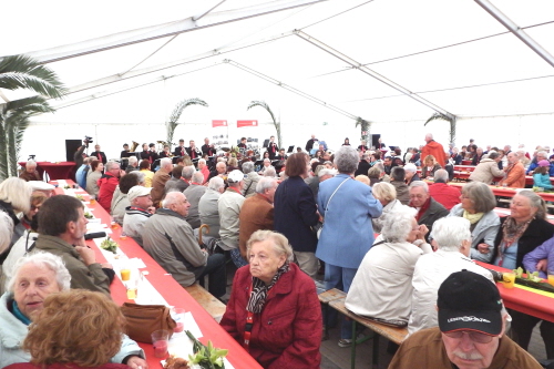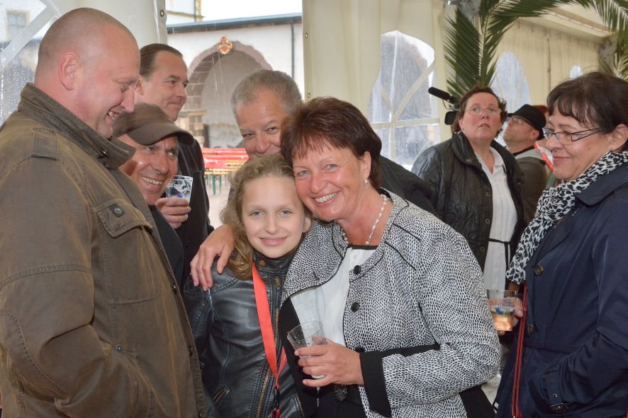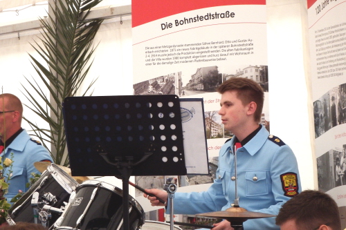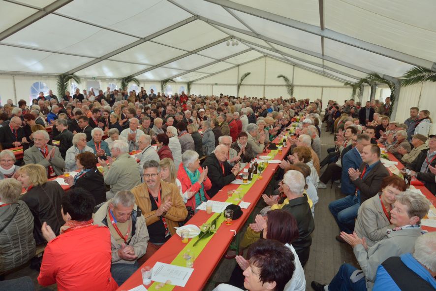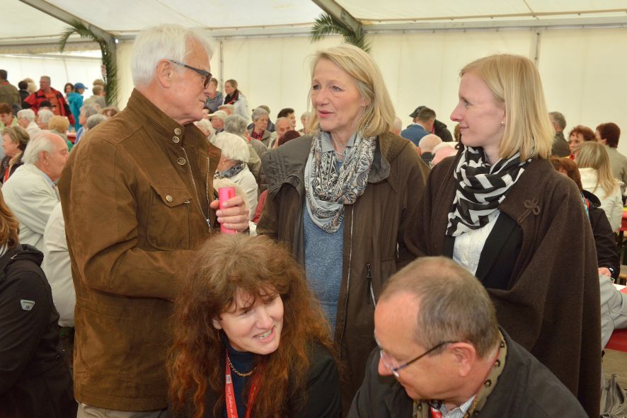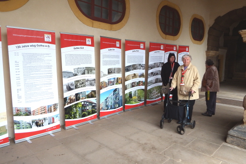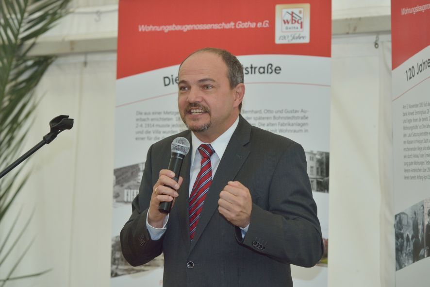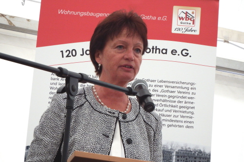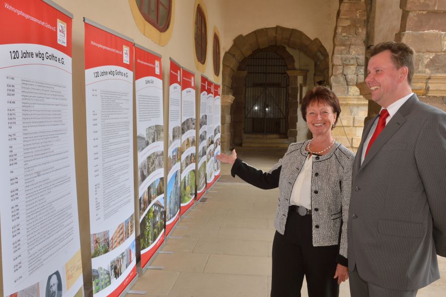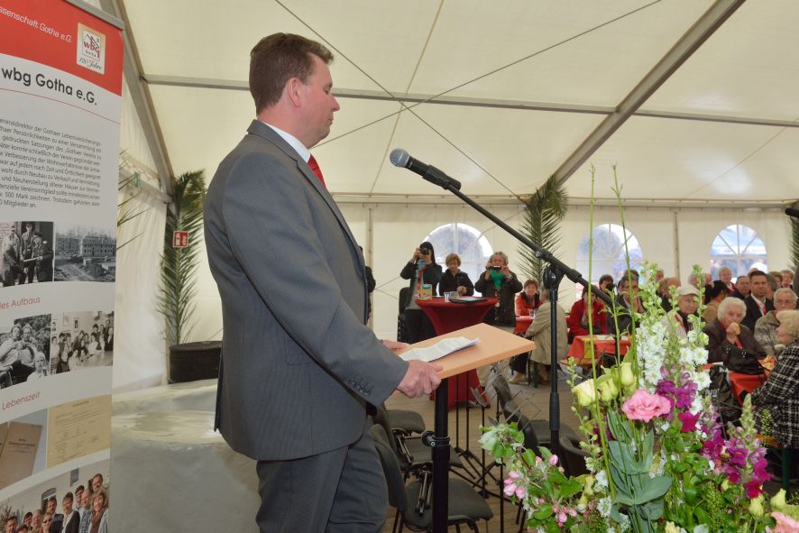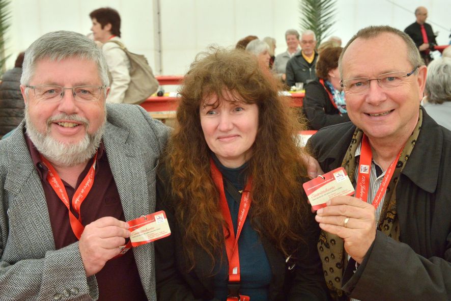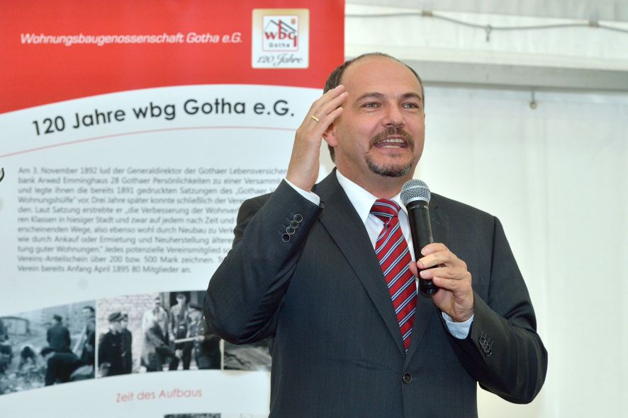 Viele Mitglieder nutzten den Nachmittag für intensive Gespräche und Erinnerungen – auf zehn Fahnen hatte die wbg ihre Geschichte in Bildern zusammengetragen. Die beiden Gothschen Originale Hänser und Schluder sorgten für einige Lacher im Festzelt – bei Atemlos, gespielt vom Fanfaren-und Showorchester Gotha, riss es schließlich die Mitglieder von den Plätzen und ließ viele lautstark mitsingen.