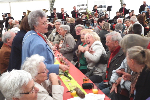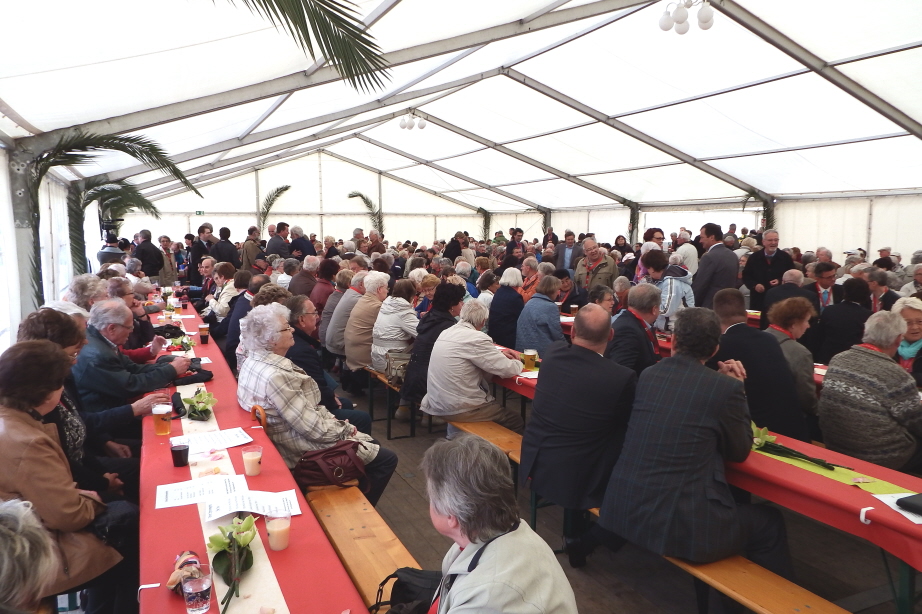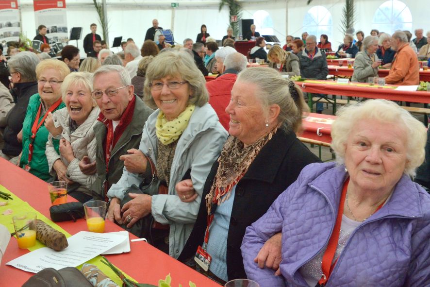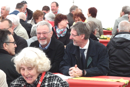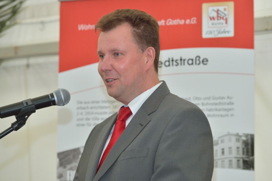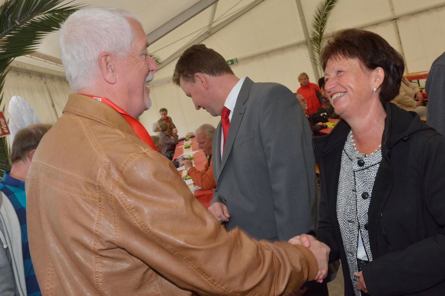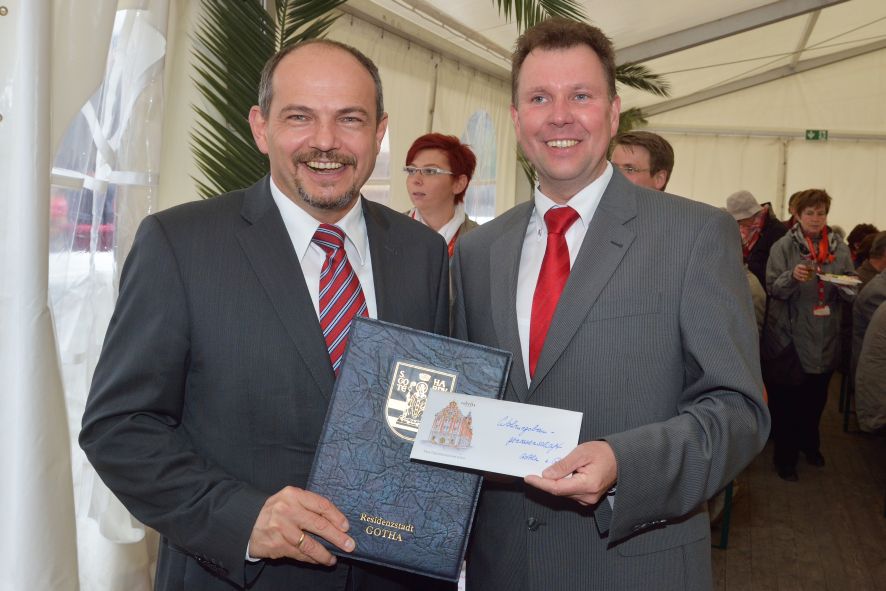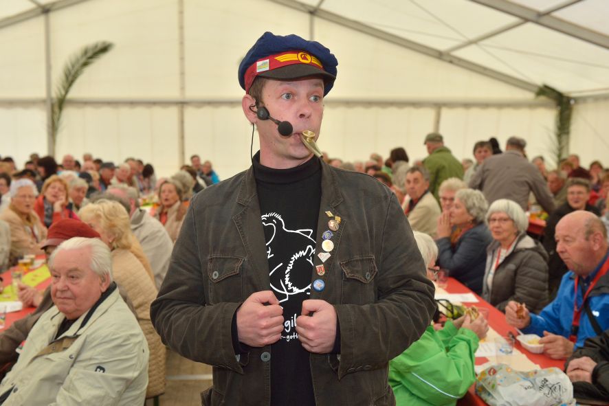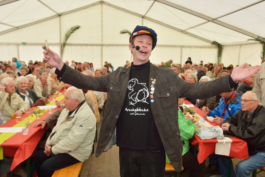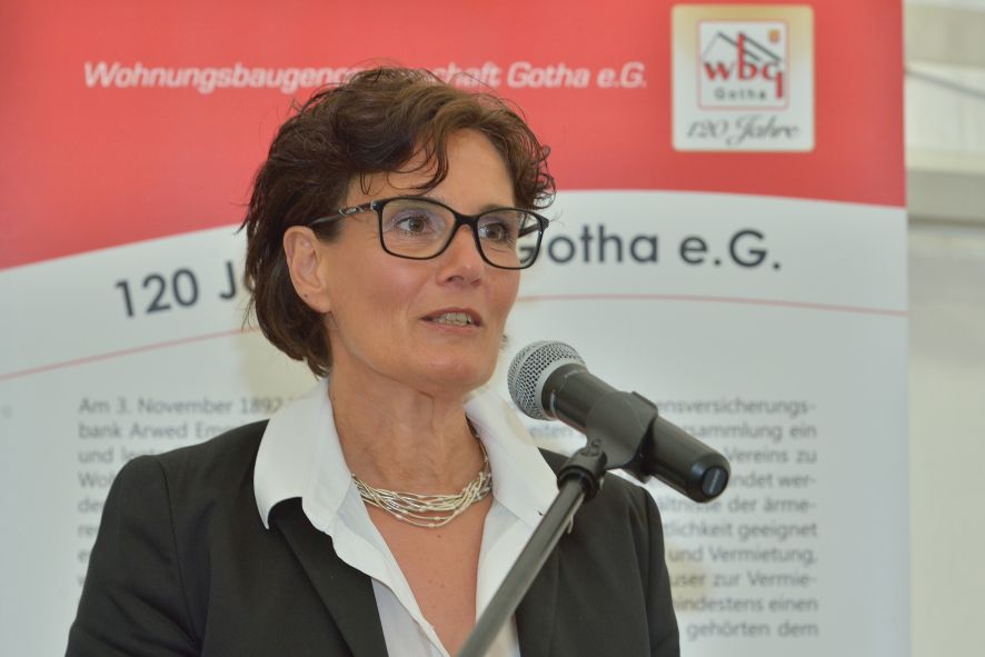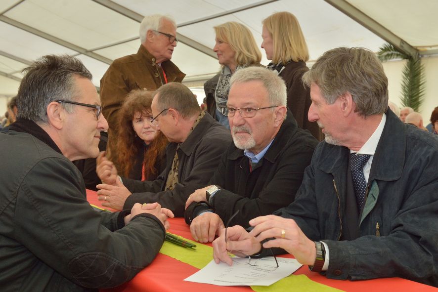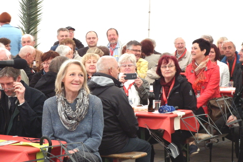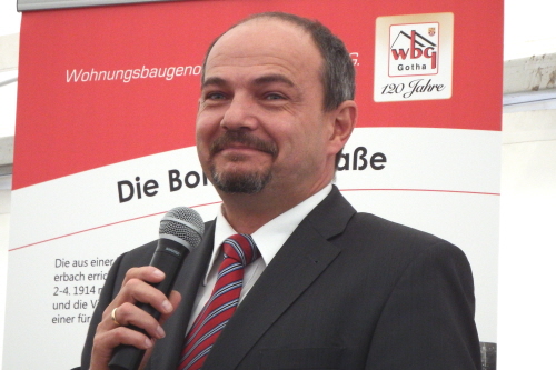 Viele Mitglieder nutzten den Nachmittag für intensive Gespräche und Erinnerungen – auf zehn Fahnen hatte die wbg ihre Geschichte in Bildern zusammengetragen. Die beiden Gothschen Originale Hänser und Schluder sorgten für einige Lacher im Festzelt – bei Atemlos, gespielt vom Fanfaren-und Showorchester Gotha, riss es schließlich die Mitglieder von den Plätzen und ließ viele lautstark mitsingen.