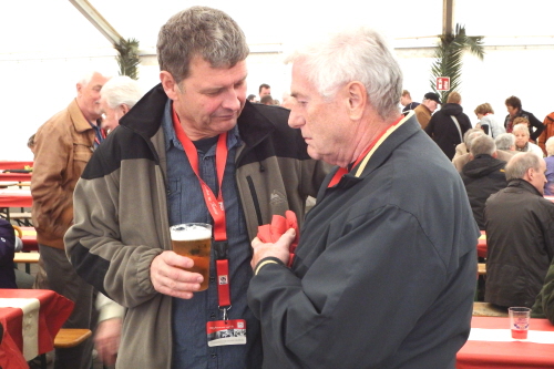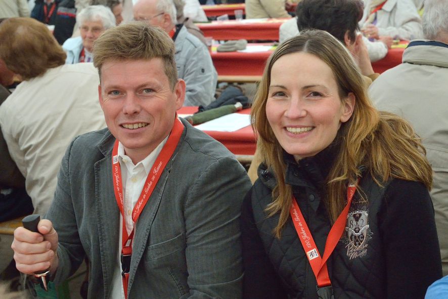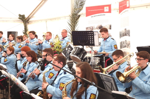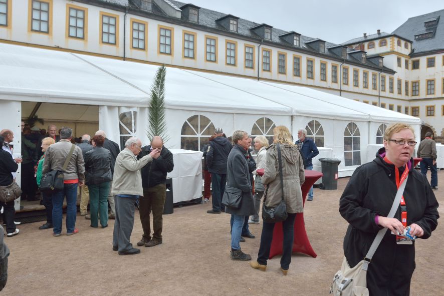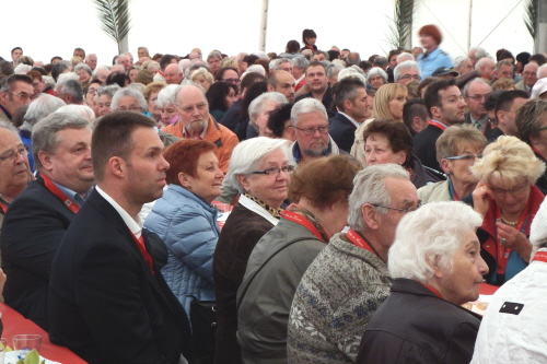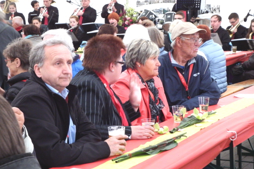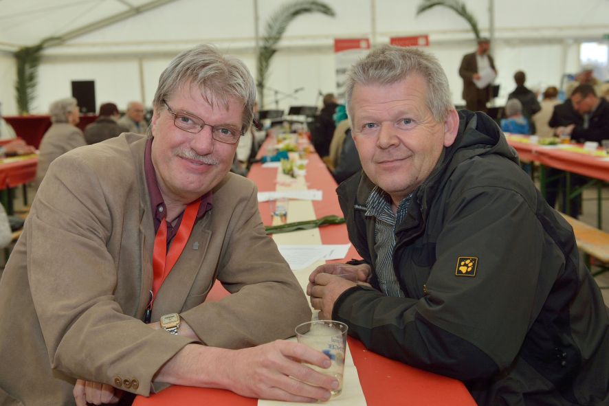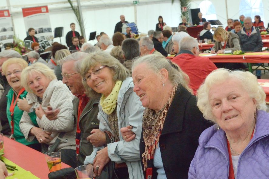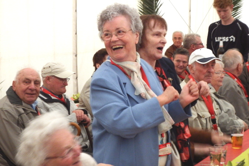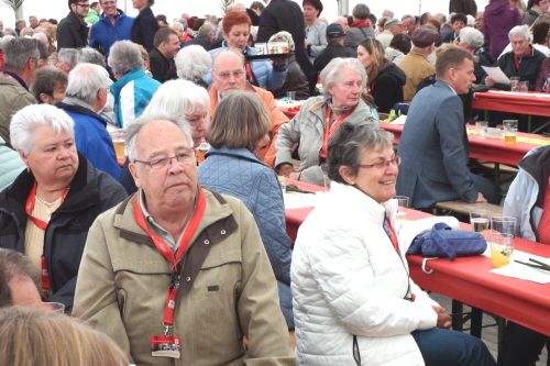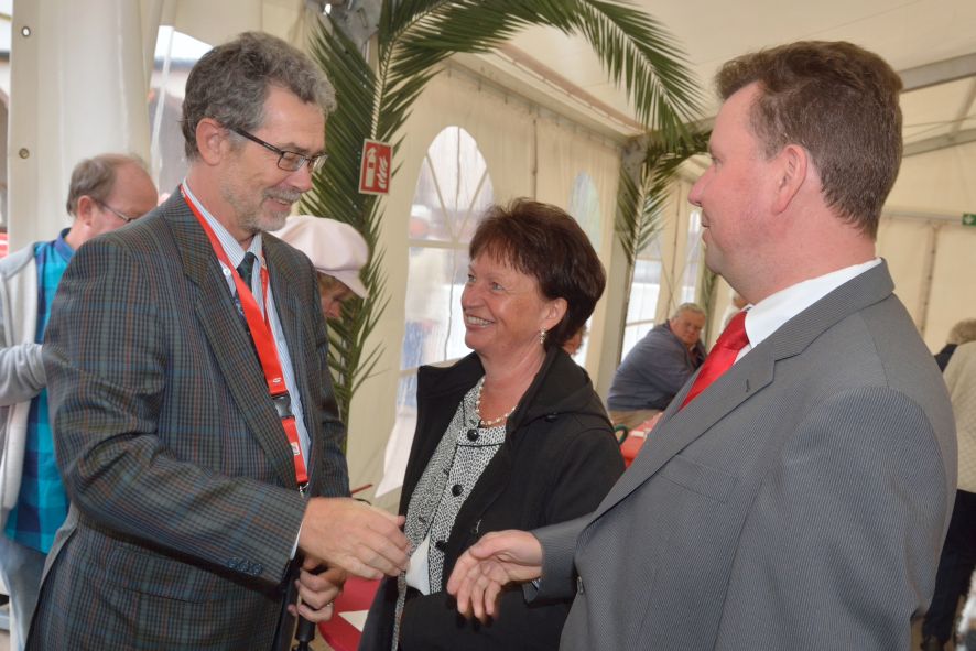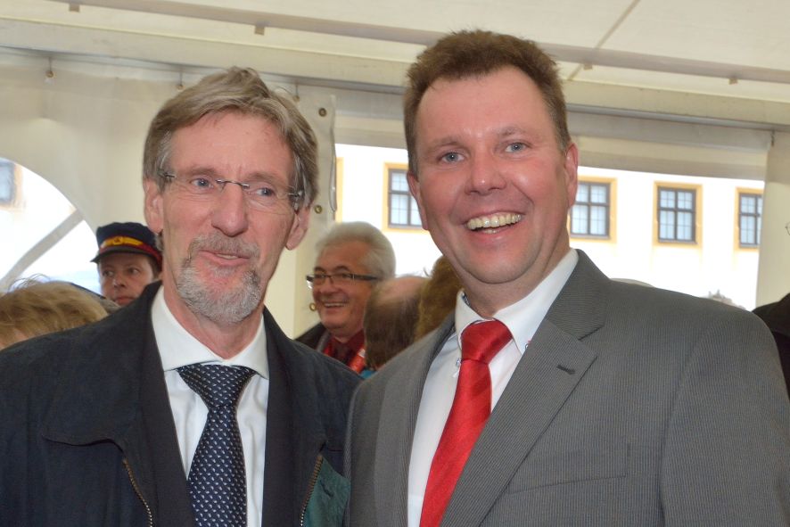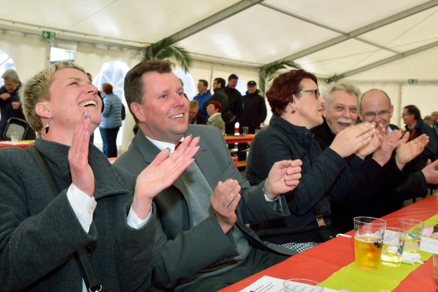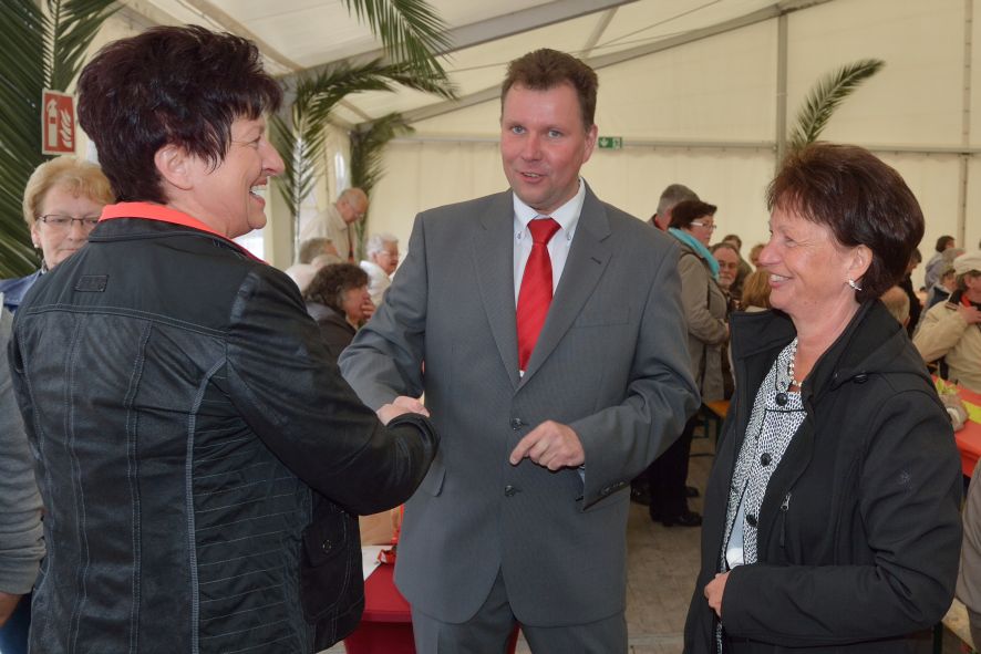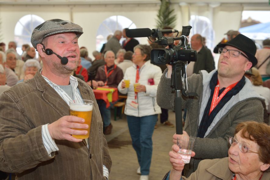 Viele Mitglieder nutzten den Nachmittag für intensive Gespräche und Erinnerungen – auf zehn Fahnen hatte die wbg ihre Geschichte in Bildern zusammengetragen. Die beiden Gothschen Originale Hänser und Schluder sorgten für einige Lacher im Festzelt – bei Atemlos, gespielt vom Fanfaren-und Showorchester Gotha, riss es schließlich die Mitglieder von den Plätzen und ließ viele lautstark mitsingen.
