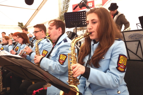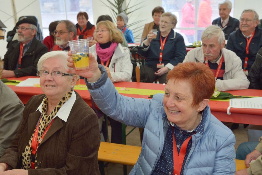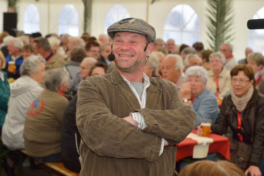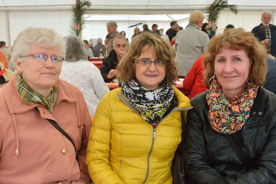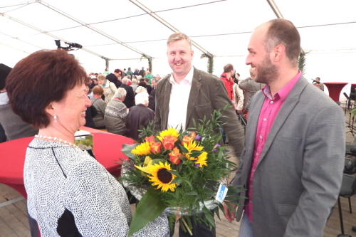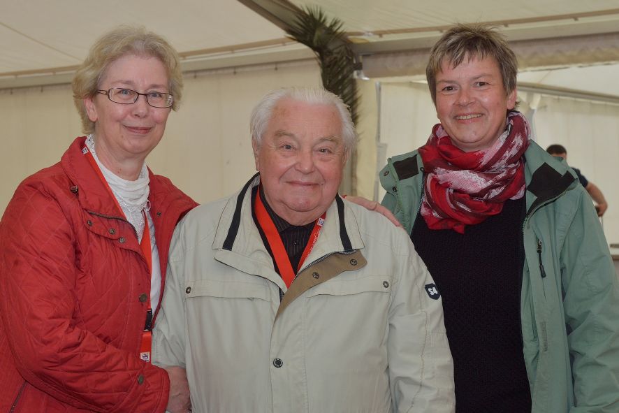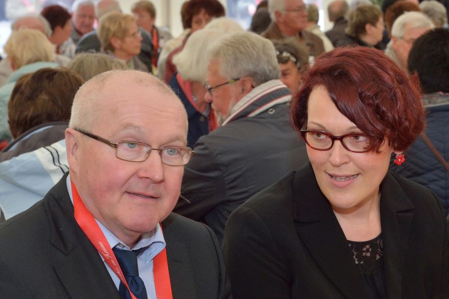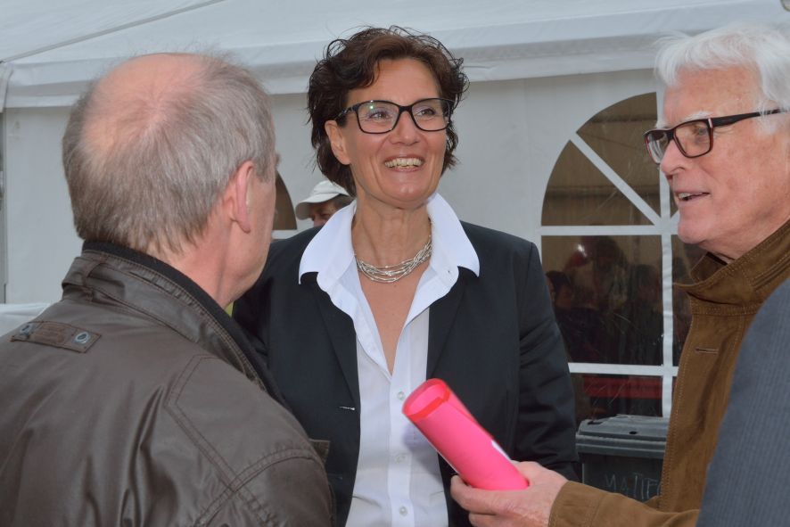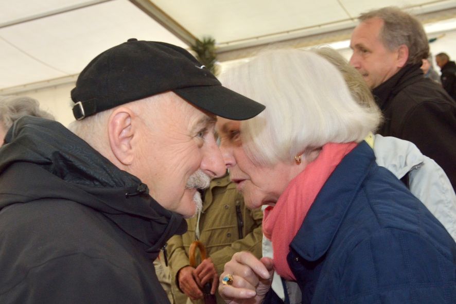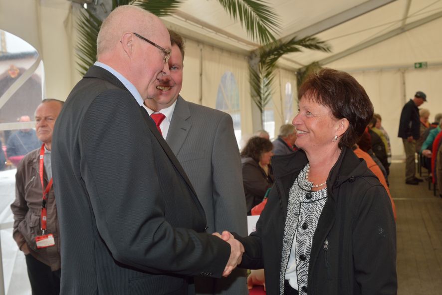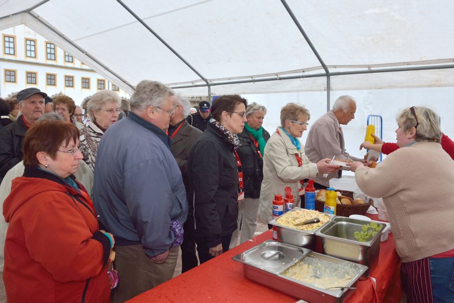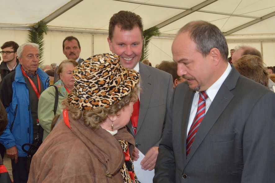 Viele Mitglieder nutzten den Nachmittag für intensive Gespräche und Erinnerungen – auf zehn Fahnen hatte die wbg ihre Geschichte in Bildern zusammengetragen. Die beiden Gothschen Originale Hänser und Schluder sorgten für einige Lacher im Festzelt – bei Atemlos, gespielt vom Fanfaren-und Showorchester Gotha, riss es schließlich die Mitglieder von den Plätzen und ließ viele lautstark mitsingen.