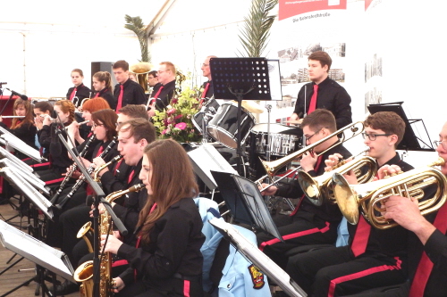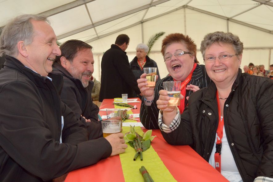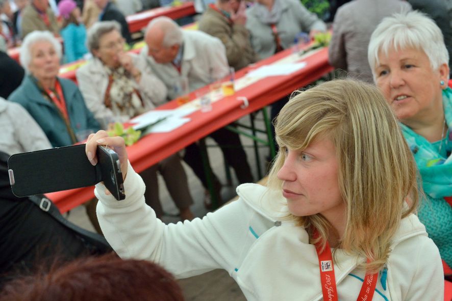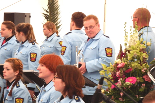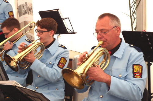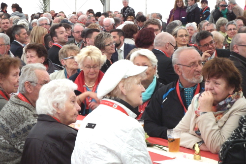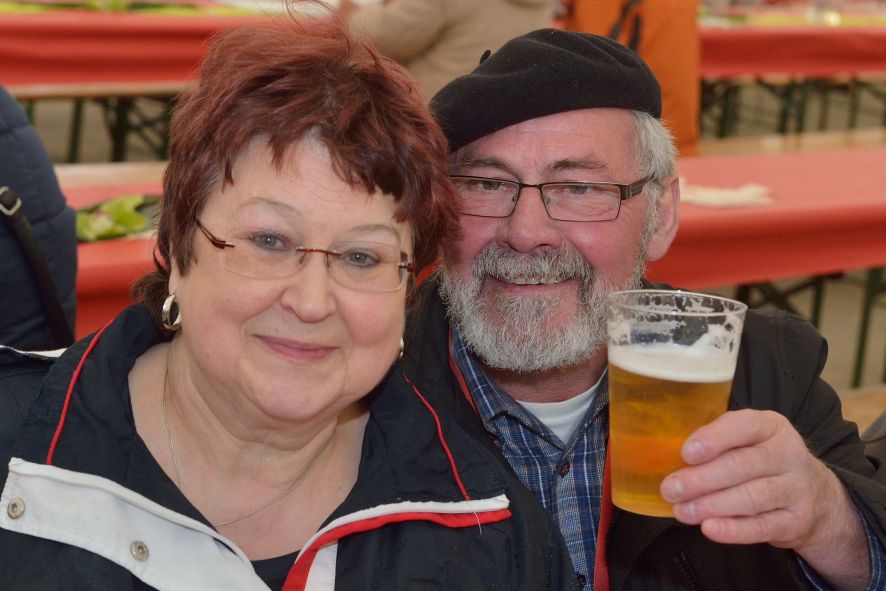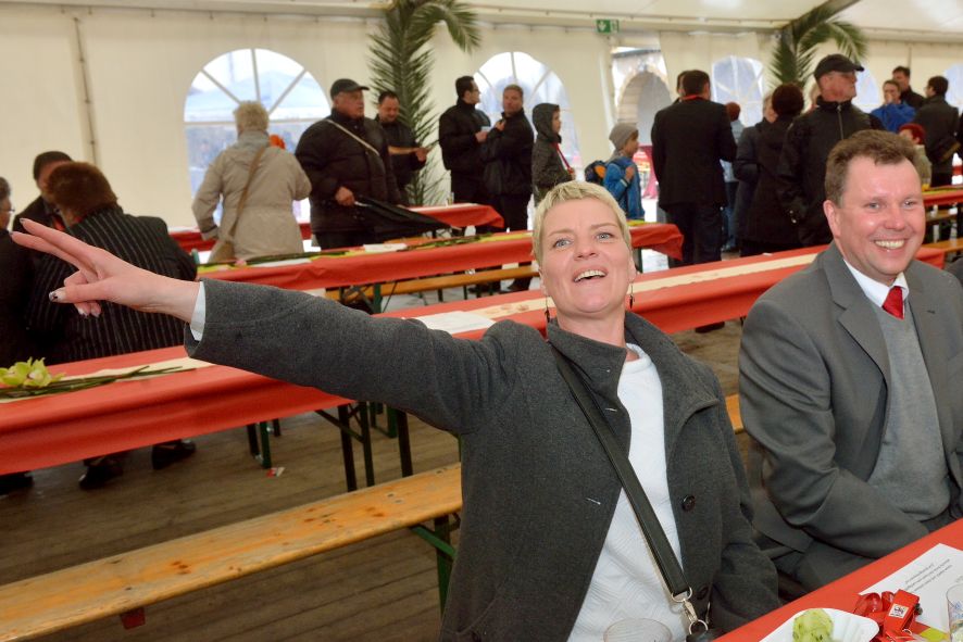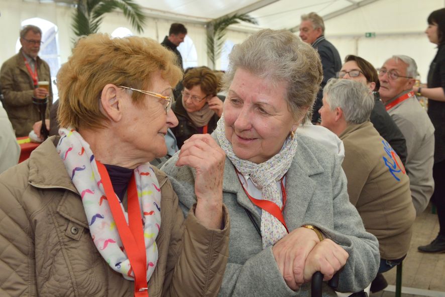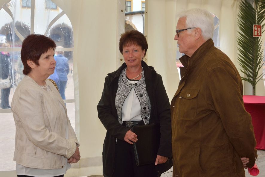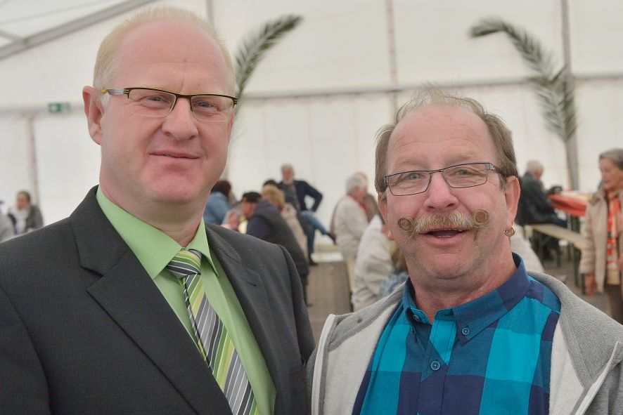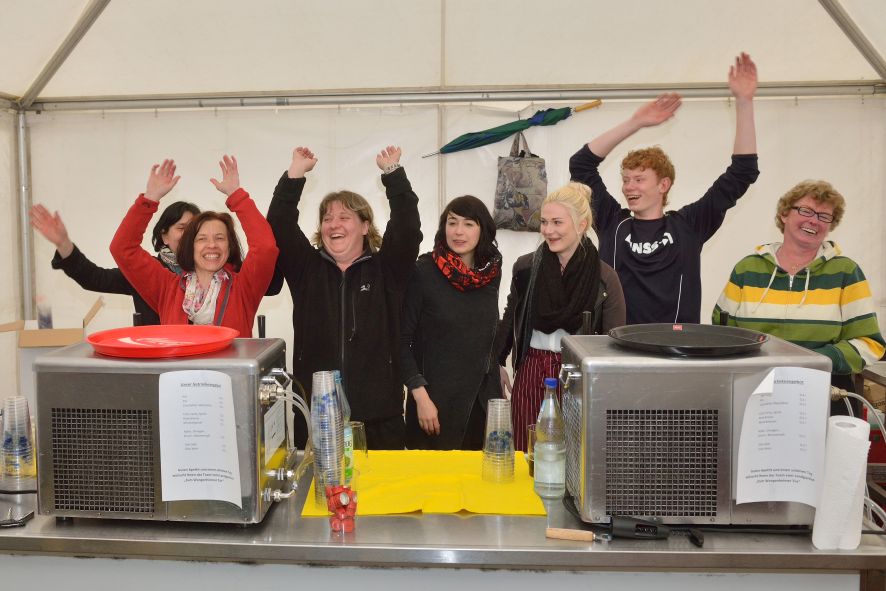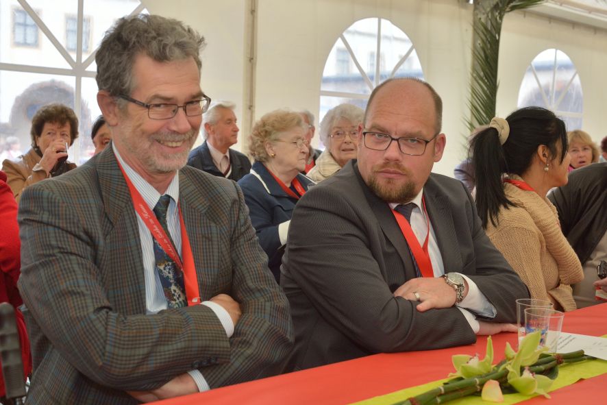 Viele Mitglieder nutzten den Nachmittag für intensive Gespräche und Erinnerungen – auf zehn Fahnen hatte die wbg ihre Geschichte in Bildern zusammengetragen. Die beiden Gothschen Originale Hänser und Schluder sorgten für einige Lacher im Festzelt – bei Atemlos, gespielt vom Fanfaren-und Showorchester Gotha, riss es schließlich die Mitglieder von den Plätzen und ließ viele lautstark mitsingen.
