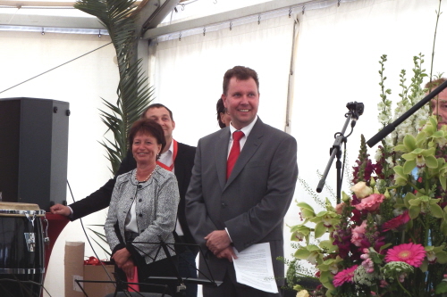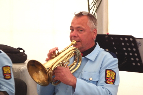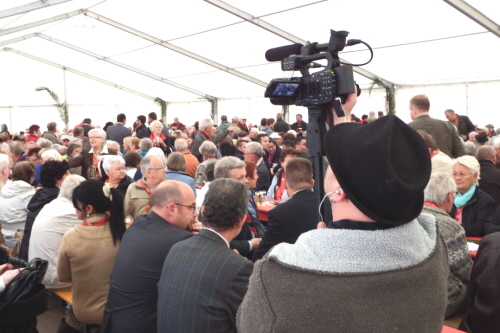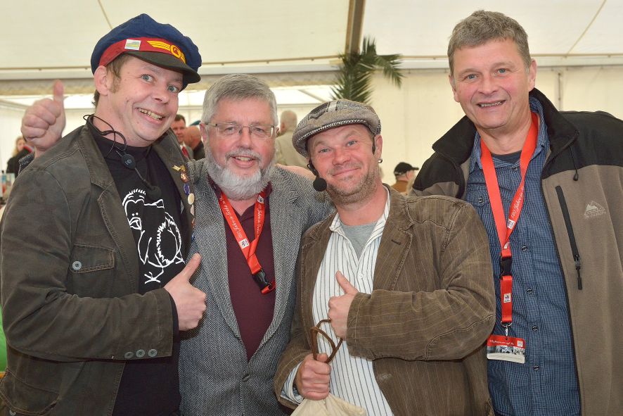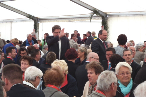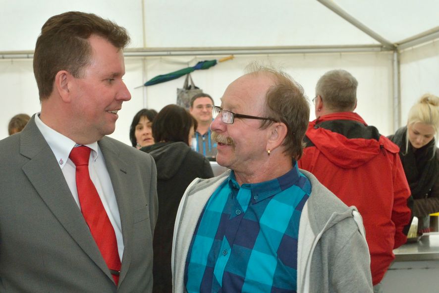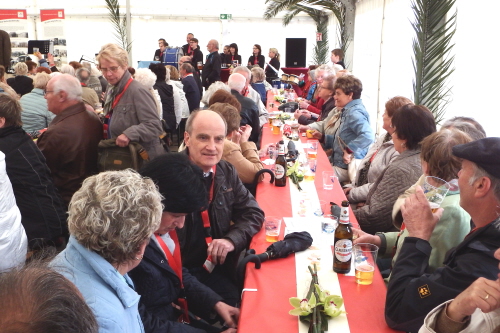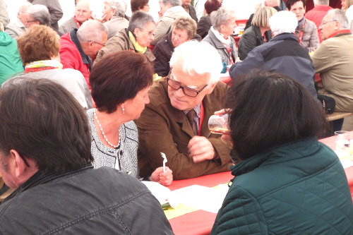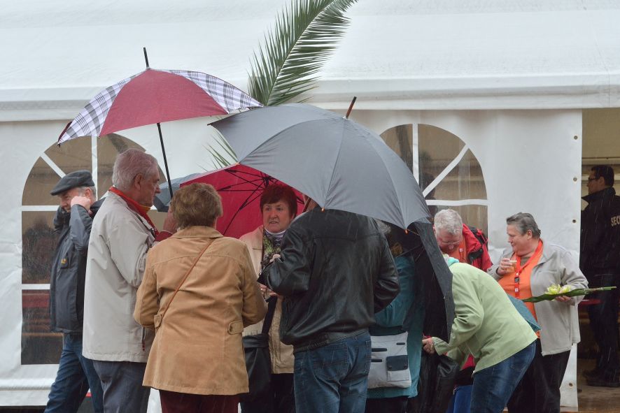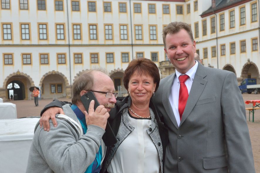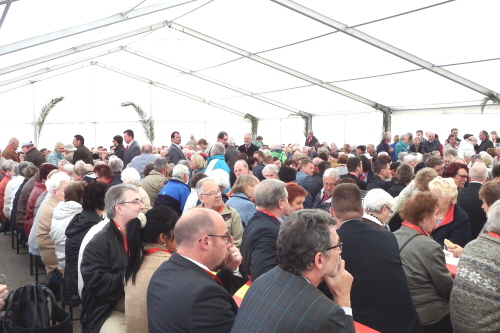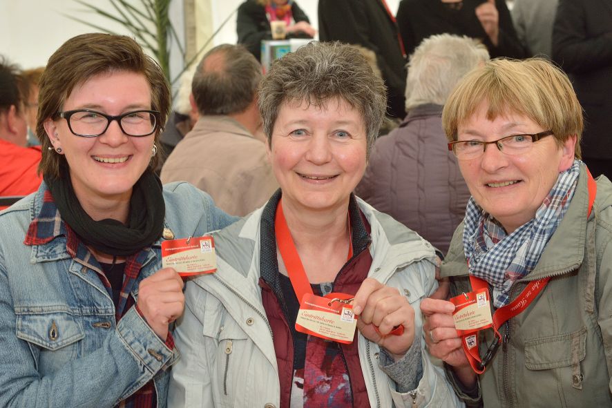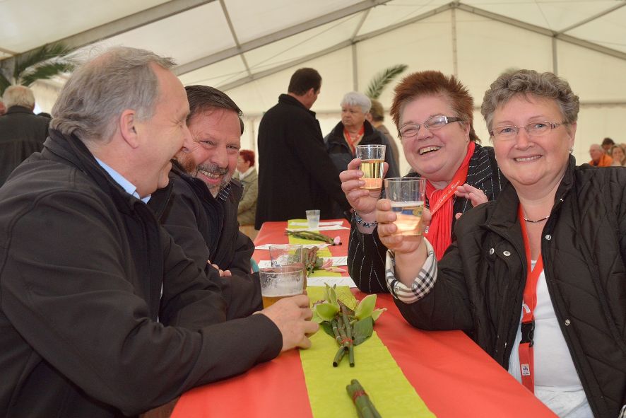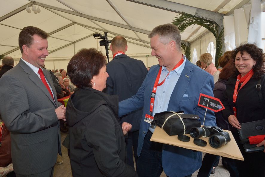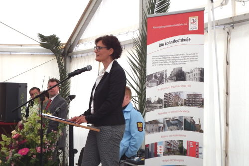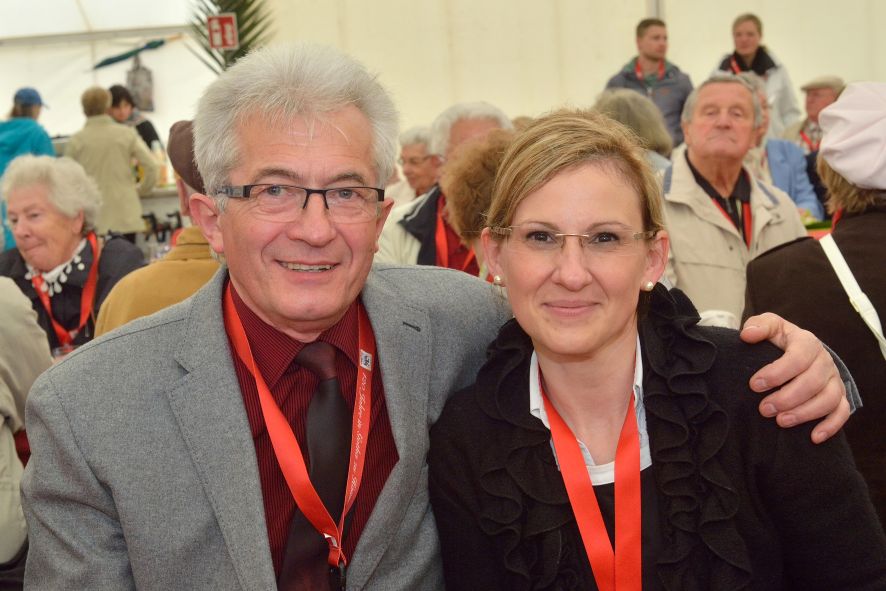 Viele Mitglieder nutzten den Nachmittag für intensive Gespräche und Erinnerungen – auf zehn Fahnen hatte die wbg ihre Geschichte in Bildern zusammengetragen. Die beiden Gothschen Originale Hänser und Schluder sorgten für einige Lacher im Festzelt – bei Atemlos, gespielt vom Fanfaren-und Showorchester Gotha, riss es schließlich die Mitglieder von den Plätzen und ließ viele lautstark mitsingen.