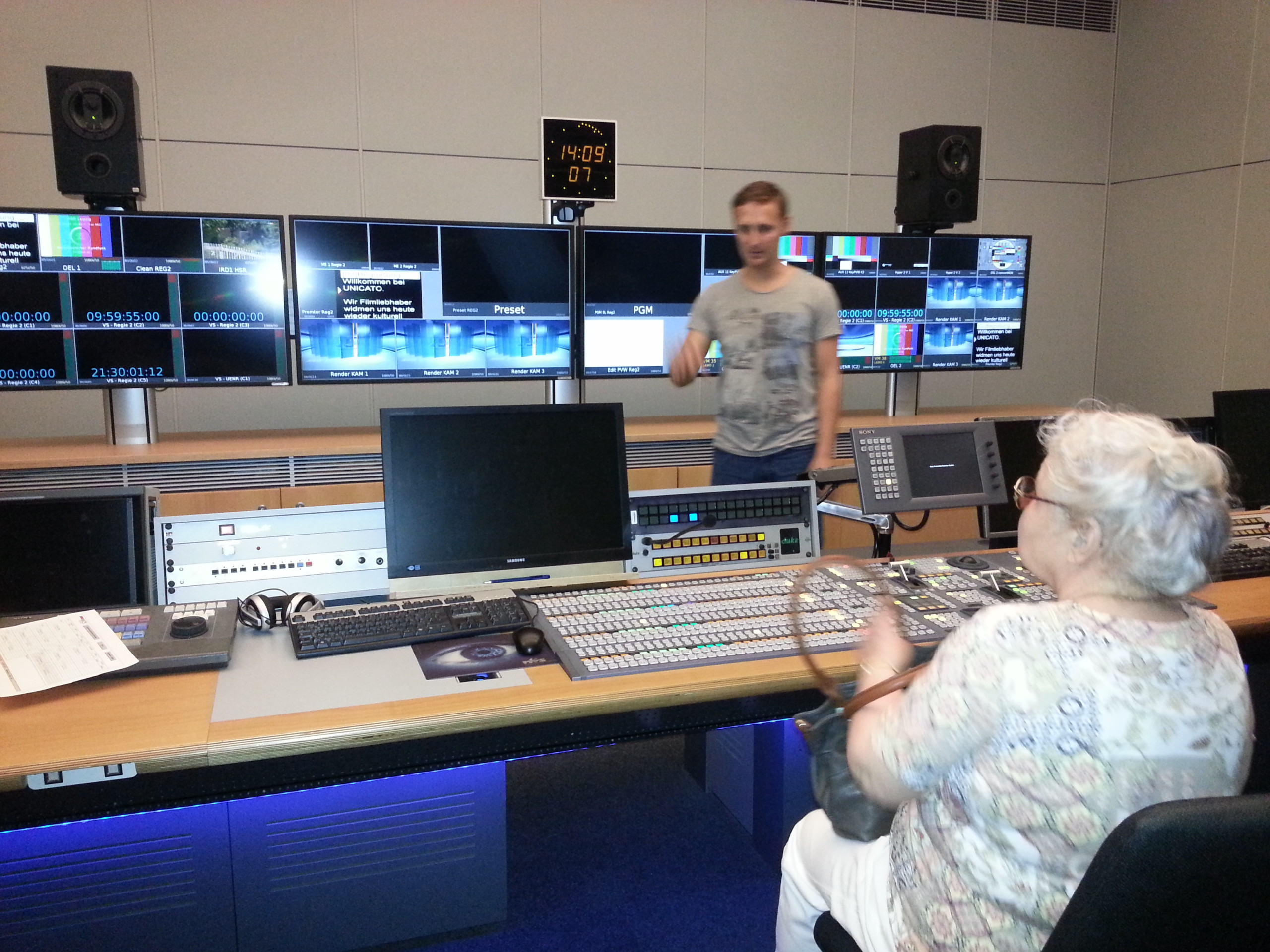 In der brütenden Mittagshitze startete die wbg-Reisegruppe am 22. Mai 2014 mit rund 50 Teilnehmern in die gut gekühlten MDR-Studioräume nach Erfurt. Zwei Mitarbeiter des MDR führten die neugierigen Gäste durch die Redaktionen, Büros und Studios – hier konnten sie den Nachrichtensprecher live erleben und sehen, wie das Nachrichtenstudio für die Abendsendung vorbereitet wird. Besonders beeindruckt zeigten sich die Besucher von der Technik, den riesigen Scheinwerfern sowie der minutiösen Abstimmung in der Regie. MDR-Mitarbeiter beantworteten ausgiebig alle Fragen und erzählten Interessantes aus dem Studioalltag. Das Ergebnis: von diesem Besuch waren alle Teilnehmer restlos begeistert.