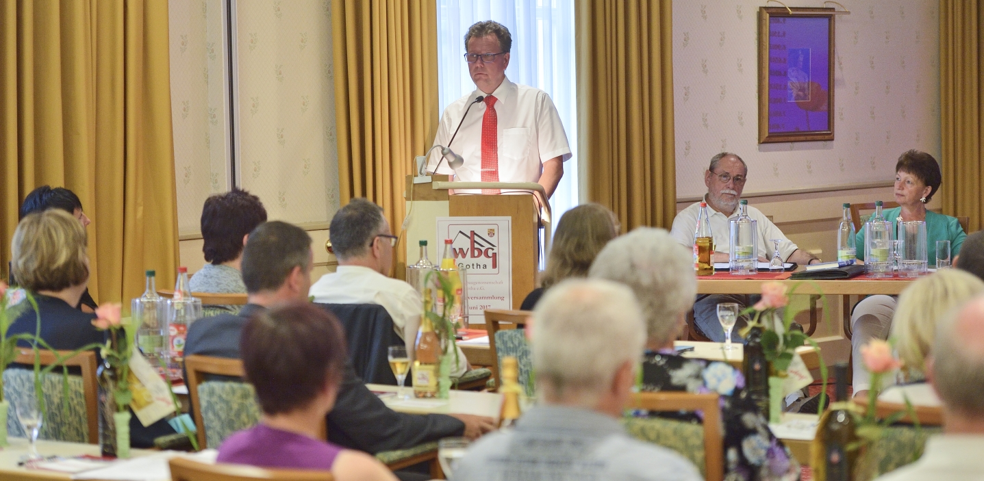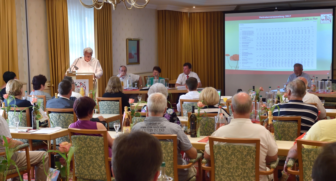 Auf ihrer jährlichen Vertreterversammlung im Hotel am Schlosspark kamen am gestrigen Donnerstag Vorstand, Aufsichtsrat und Vertreter der Wohnungsbaugenossenschaft Gotha e.G. (wbg) zusammen, um Bilanz zum vergangenen Geschäftsjahr 2016 zu ziehen. Sowohl zu den Unternehmenszahlen des Vorjahres als auch zum branchenweiten Durchschnitt konnte hier eine deutliche Steigerung festgehalten werden, was dieses Ergebnis zu einem der besten der jüngeren Genossenschaftsgeschichte macht. Das schlägt sich unter anderem in der erneut vergebenen Ratingnote 1 der Banken und einer Leerstandsquote von unter vier Prozent nieder. Eine Bestätigung des aktuellen Kurses erfolgte auch durch die Vertreter, die alle Beschlüsse einstimmig fassten, den Jahresabschluss bestätigten sowie Aufsichtsrat und Vorstand entlasteten.