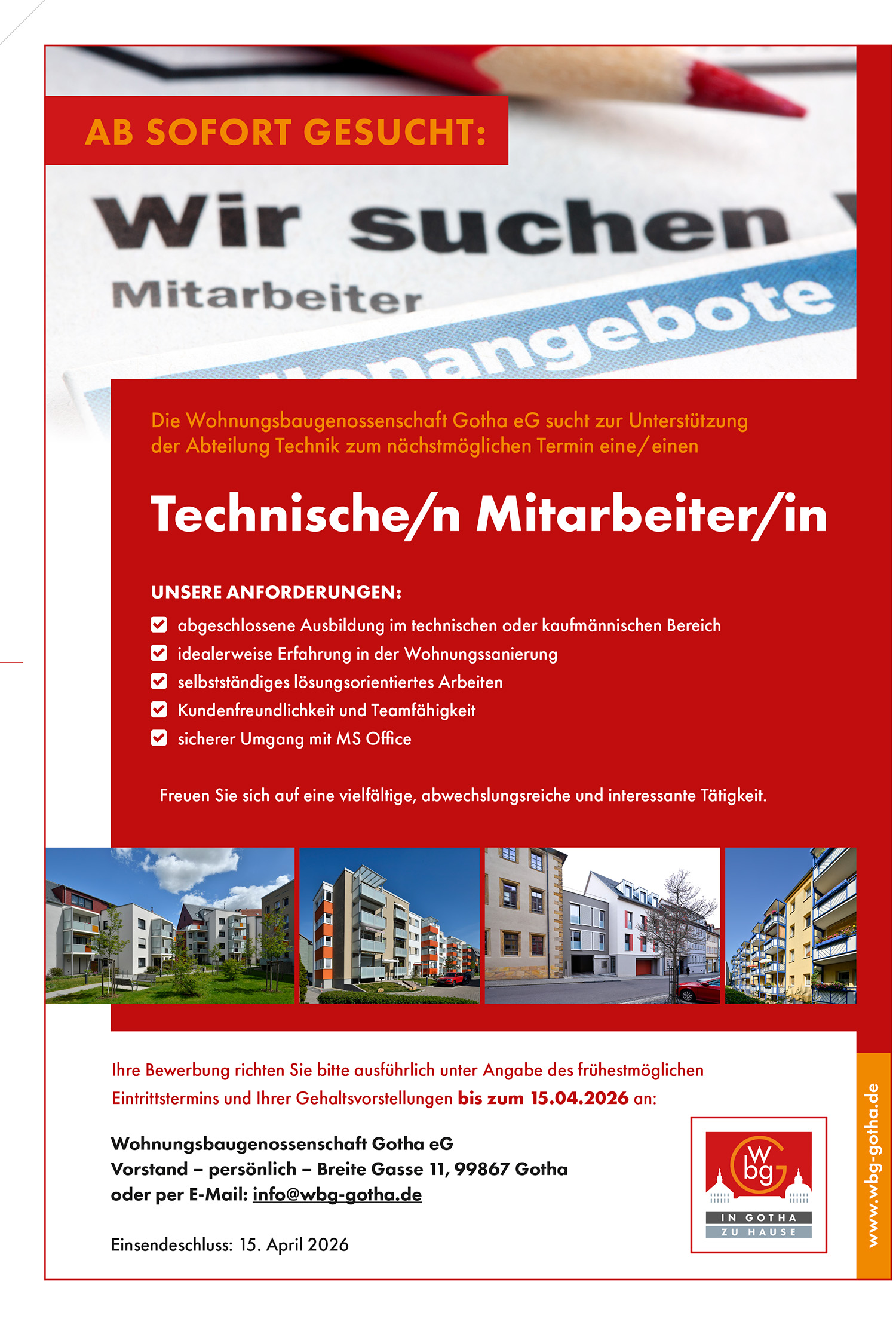 Die Wohnungsbaugenossenschaft Gotha eG sucht zur Unterstützung